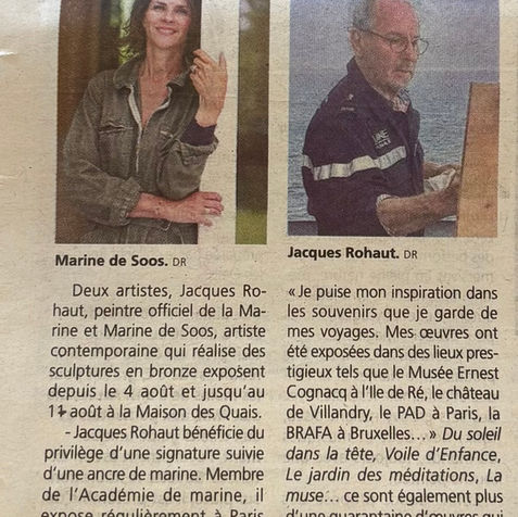 Deux artistes, Jacques Rohaut, peintre officiel de la Marine et Marine de Soos, artiste contemporaine qui réalise des sculptures en bronze exposent depuis le 4 août et jusqu’au 14 août à la Maison des Quais.